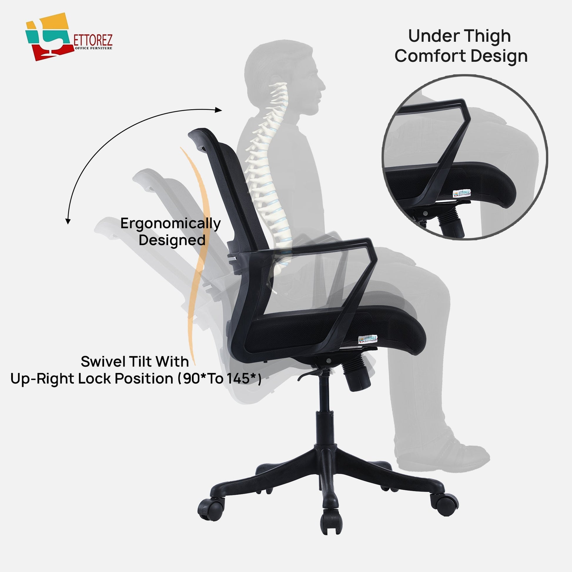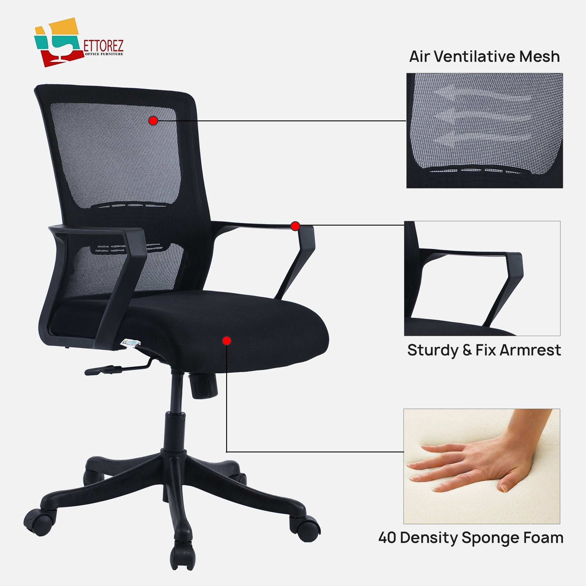 Ettorez ACTIVA BLACK Mid Back Mesh Revolving Chair with Fixed Armrest