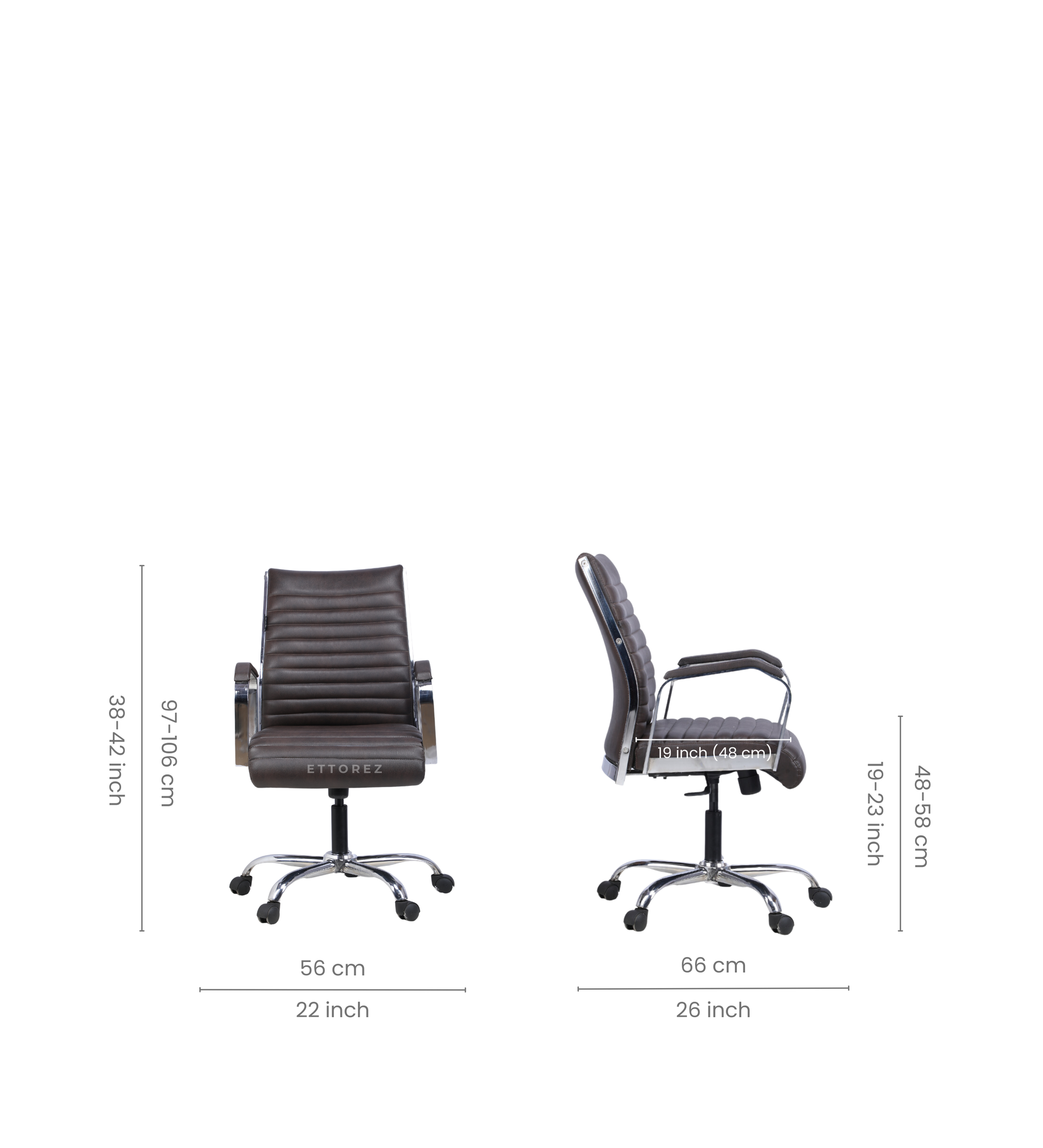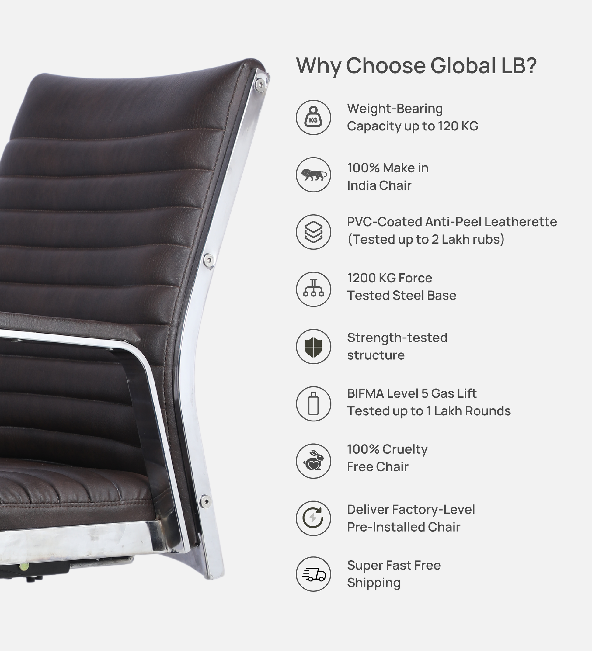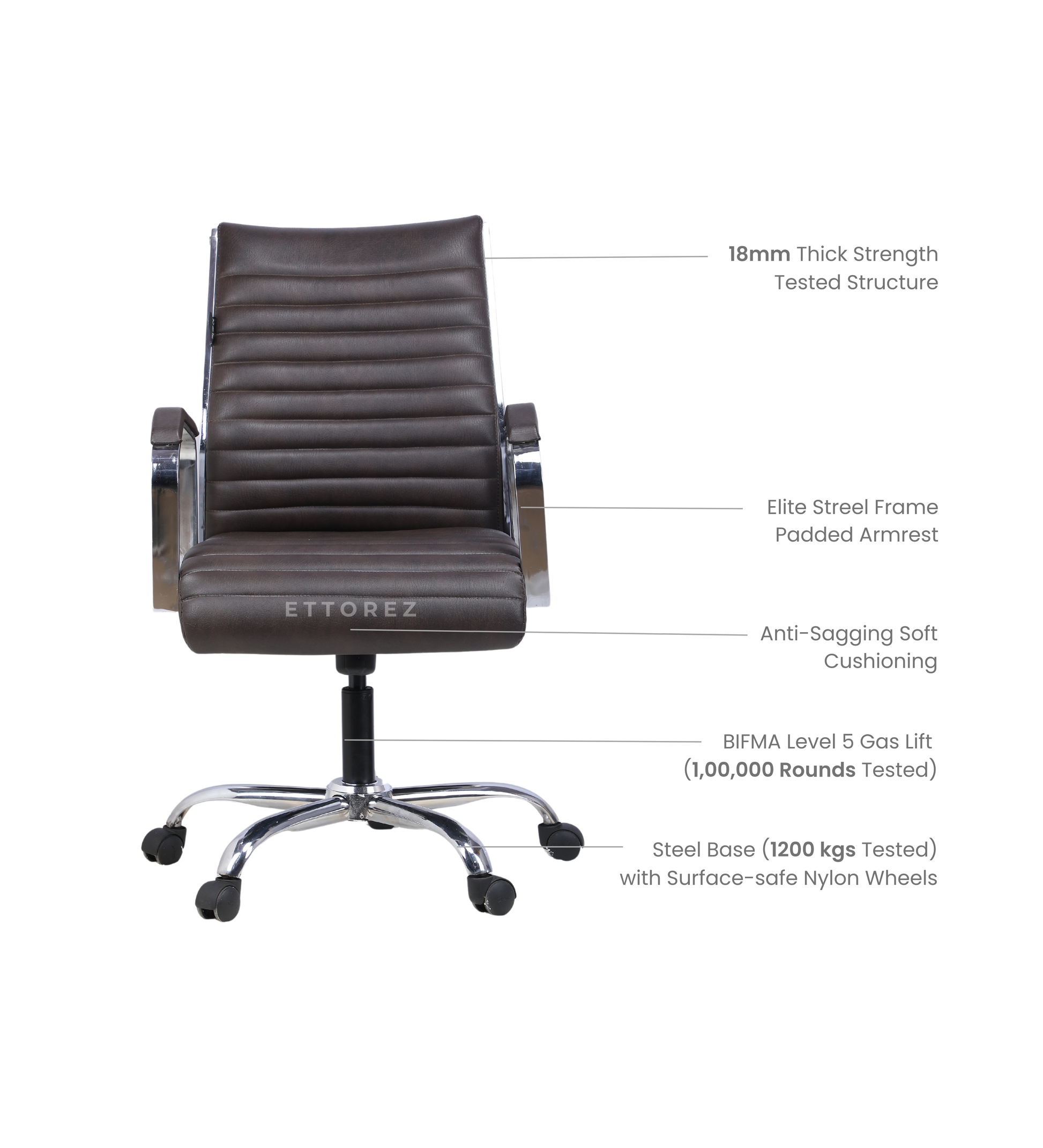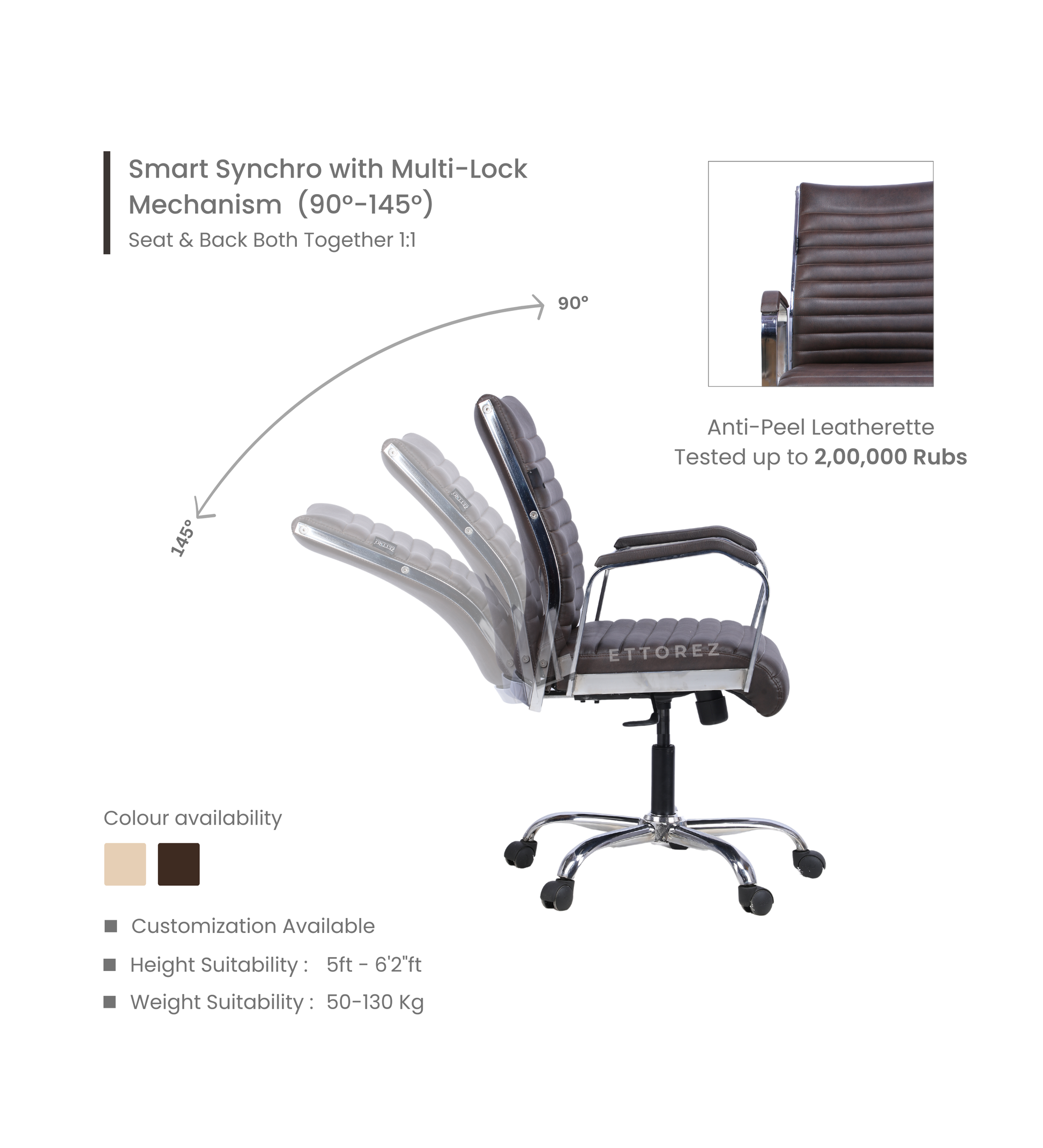 Structure Type Solid Steel Frame Leatherette Type Anti-peel (2 Lakh rub tested ) Cushioning 40 Density Feather Foam+Polyfi Armrest Steel Armrest covered with leatherette Armrest Functionality Full Arm Support Mechanism Smart Synchro with Multi Lock Mechanism Tilt Type Free swing Mechanism Lock Type Multi Lock Gaslift Tested up 100000 rounds Base Chrome Steel Base (1200 KG Tested) Wheel Noise-free Nylon Special Feature 1 Cushioned Arms for full support Ideal User's Height Reference 5'0"-6'0" Ideal User's Weight Reference 40-100kg Customization Any color-MOQ 6 pcs
